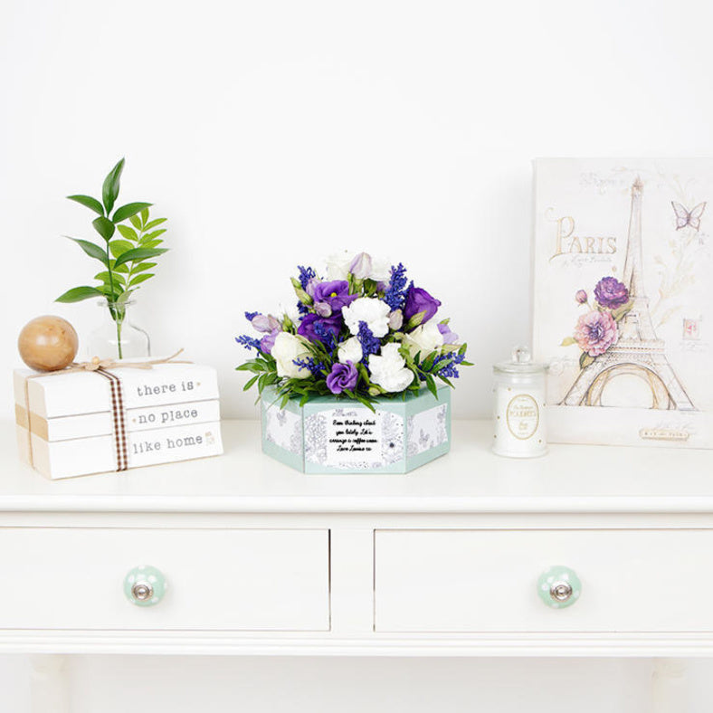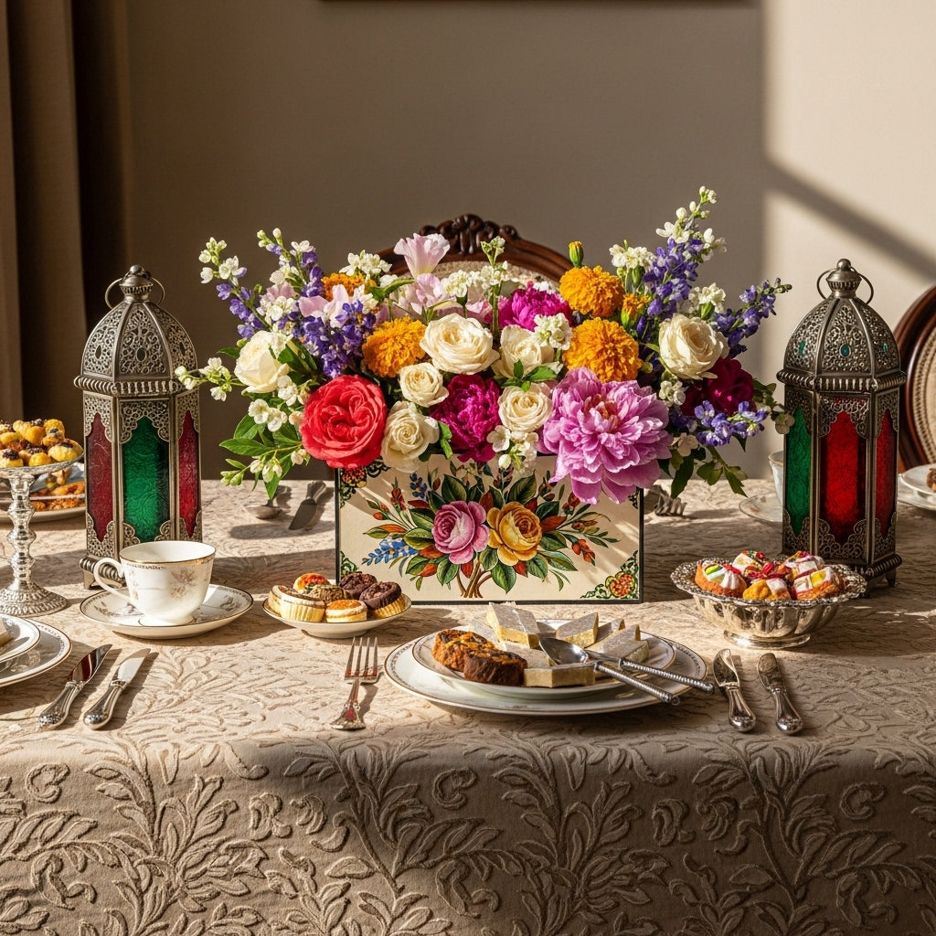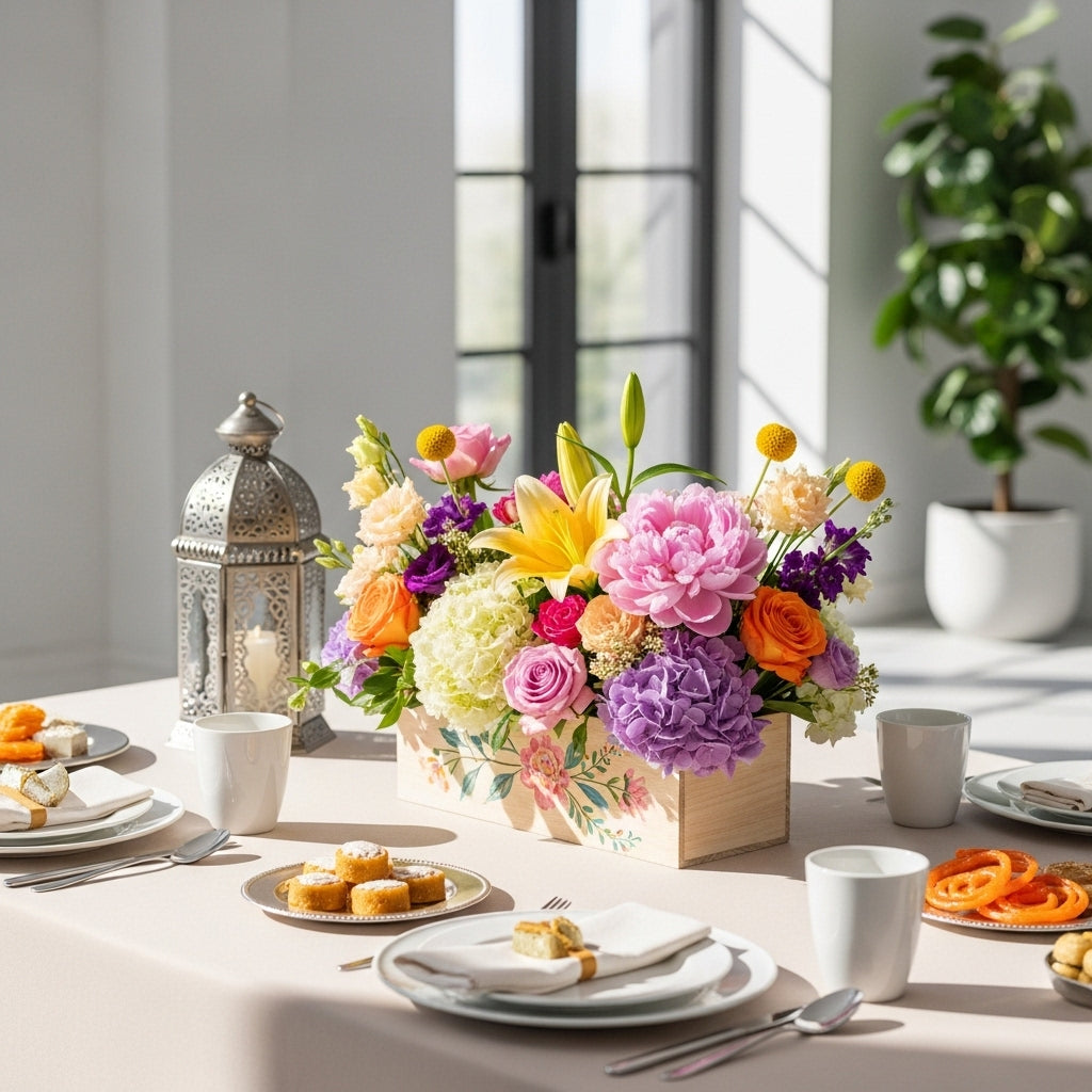 Celebrate the spirit of Eid with our exquisite PhoolPatra Flower Box, thoughtfully arranged to bring joy and elegance to your festivities. This special edition features a luxurious blend of white freesias, fragrant lavender, and delicate blooms, beautifully presented in a handcrafted L-shaped box adorned with traditional floral watercolor art. Perfect for gifting to loved ones or enhancing your own celebration, the box combines timeless artistry with lasting beauty, symbolizing peace, gratitude, and new beginnings. Share the warmth and blessings of Eid with a gift that speaks from the heart.